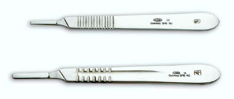 Manici per lame bisturi intercambiabili n.3 e n.4, realizzati in acciaio inox.